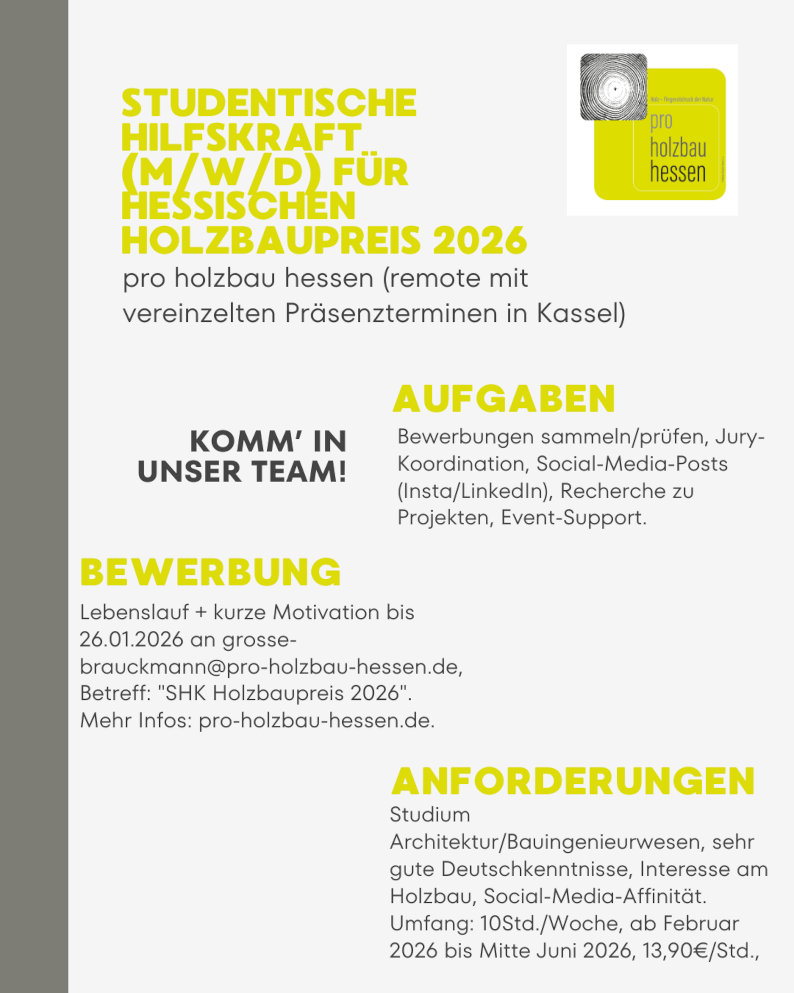 Ein Holzbau-Positionspapier von pro holzbau hessen und der Architekten- und Stadtplanerkammer Hessen bildet die Grundlage für die Holzbauoffensive. Eine Gesprächsgrundlage und Impulsgeber für hessische Landtagsfraktionen sowie weitere politische und gesellschaftliche Multiplikatoren und Entscheidungsträger.